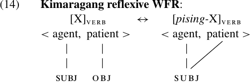 We might represent the effect of this prefix as in (14). The right side of the rule in (14) indicates that the reflexive verb assigns two semantic roles to the same participant. That participant bears only one Grammatical Relation (SUBJ), and so must be expressed by a single NP. This rule expresses the fact that reflexivization changes transitive verbs into intransitives.