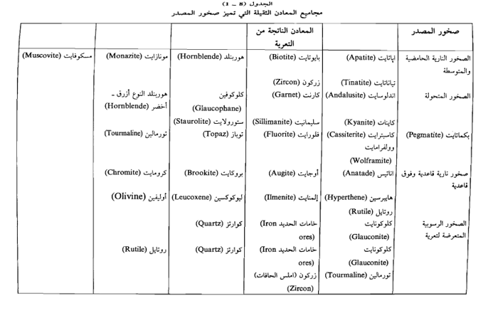توجد في الجدول (8 - 1) مجاميع المعادن الثقيلة الموجودة في الرسوبيات وقد وضعت بأعمدة تحت الصخور التي اشتقت منها.