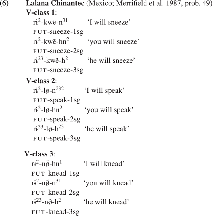Morphologically conditioned suppletion appears to be less common than the lexical or phonological conditioning discussed above; at least it is harder to find cases where this is clearly the correct analysis. As another example, the future tense prefix in Lalana Chinantec has two allomorphs: /rɨ 2-/ when the verb is marked for first or second person vs. /rɨ23-/ when the verb is marked for third person. (The number 3 represents low tone, 1 is high tone.) This change in tone is not phonologically conditioned. The subject agreement suffixes appear in several different allomorphs, which are lexically conditioned. However, the tone pattern associated with the suffix does not affect the tone of the prefix; this seems to be determined strictly on the basis of person, as illustrated in (6).2