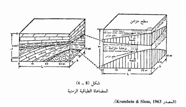 ولقد عبر كرومباين وسلوس في كتابهما Stratigraphy and Sedimentation» عن تمثيل الأطوال المختلفة في المقاطع الجيولوجية بأشكال مجسمة (لاحظ الشكل (8- 6) حيث يمثل الحرفين L الأفقيين الطول والعرض بالأميال والحرف «L» في الموقع العمودي السمك بالأقدام وفي الدراسات الطبقية الزمنية فإن السمك يمثل أيضاً الزمن الجيولوجي لذا فإن الشكل (B) قد تمثل فيه الحرف «T» عمودياً بدلاً من «L» وقد عبر عن الشكل المجسم B بمصطلح المساحة - الزمن لأن البعديين L يمثلان مساحة والعمودي يمثل الزمن.
