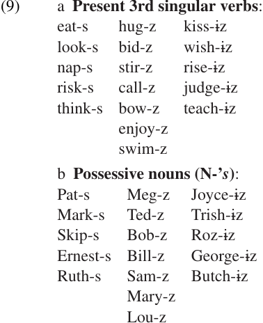 But there is an important difference between the pattern in (8) and those in (1) and (2). In (2) there is no phonological similarity at all between the two allomorphs (/-i/ vs. /-ka/). In (1), there is a partial phonological similarity between the two allomorphs (a vs. an); but it seems unlikely that the two can be related by any regular process. The alternation between a and an is unique: there are no other morphemes in modern English in which a final /n/ is always deleted before consonants, or inserted before vowels.1 The alternation in (8), however, is part of a more general pattern. Essentially the same changes are observed in the third person singular agreement suffix (9a) and the possessive clitic (9b).