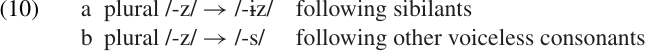 English plural nouns are marked in several different ways, some of which are illustrated in (8). As in (1) and (2), the choice between the variant forms of the plural suffix is phonologically determined. It depends only on the final phoneme of the stem: the form /-ɨz/ occurs after sibilants (grooved fricatives); the voiceless fricative /-s/ occurs after other voiceless consonants; and the voiced fricative /-z/ occurs elsewhere.