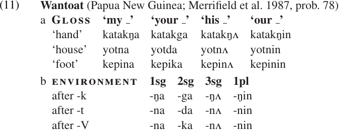 To illustrate how these criteria can be applied, let us consider the Wantoat data in (11a). The allomorphs of the possessive suffixes are summarized in (11b).