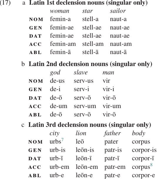 Latin nouns are inflected for case and number, with both of these categories being marked by a single portmanteau suffix. The suffix which marks a particular combination of case and number, e.g. dative plural, can appear in several different forms (or allomorphs), and the distribution of these allomorphs is lexically conditioned. Each Latin noun can be assigned to one of five distinct sub-classes, or declensions, depending on the set of inflectional allomorphs which attach to that particular stem. Three of these declensions are illustrated in (17); for simplicity, only the singular paradigms are listed.