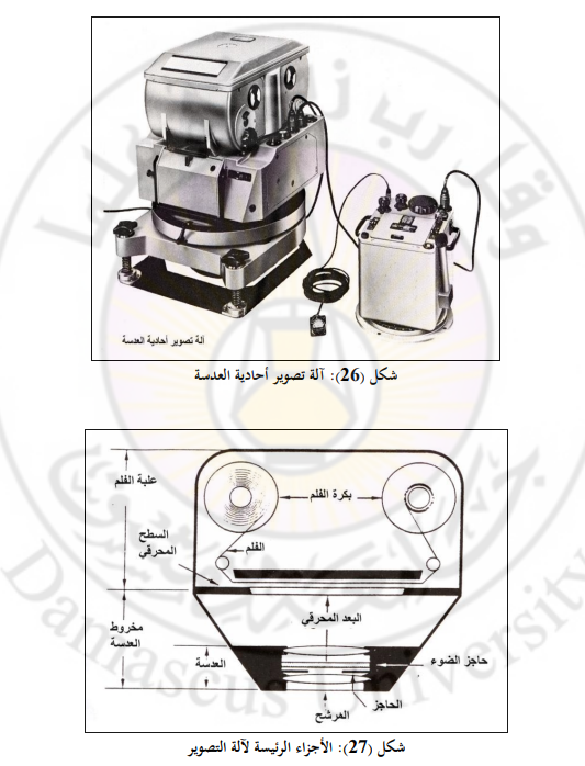 ويتم الحصول على صورة عند انفتاح مغلاق آلة التصوير بوساطة جهاز إلكتروني يدعى مؤقت المغلاق Intervalometer. والبعد المحرقي للعدسة هو 152 ملم وأحياناً قد يكون 90 ملم أو 210 ملم ، أما العدسات ذات البعد المحرقي الأطول والذي يبلغ بعدها المحرقي 300 ملم فتستخدم لتصوير المناطق ذات الارتفاع العالي. انظر الشكلين (26 و27) اللذين يُظهران آلة التصوير أحادية العدسة والأجزاء الرئيسة المكونة لها تتألف هذه الآلة من جسم الآلة الذي يتألف بدوره من عدسات مخروطية تجمع الأشعة الواردة من الظاهرة وترسلها من خلال البعد المحرقي والمغلاق الذي يقوم بتوقيت زمن التقاط الصورة، والمرشحة (فلتر) التي تقوم بعملية الترشيح حسب ما هو مخطط لها إن نوعية الصورة الملتقطة بهذه الآلة متعلقة بنوعية الفيلم وقدرة التمييز وعوامل مختلفة أخرى حالياً تستخدم هذه الأنواع من الآلات أفلاماً ذات قياس واحـد هـو 23×23 سم ، ولكن عدسات مختلفة للحصول على صور متنوعة عن الظاهرة 15 صورمتنوع الواحدة ومن أجل استخدام أجل استخدام أجهزة متممة أخرى وهي منظم التغطية حيت إن كل صورة تغطي من التي سبقتها نسبة محددة ومن ثم يجب أن تحتوي هذه الآلة جهازاً لتنظيم عملية التغطيـة قـد يـكـون هـذا وأخرى يمكن في عدم كانيات هذه الآلة بشكل جيد وعملي يجب إضافة الجهاز ملحقاً بها أو مبنياً معها. إضافة إلى مُشغل إلكتروني لتحريك الفيلم وتشغيل المغلاق آلياً.