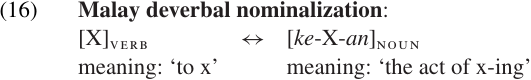 Our immediate goal is to provide a way of describing non-linear morphological processes as part of a basic grammatical description. For this purpose, we will adopt an approach closer to the Item and Process (IP) model. In a sense, such an approach is already built into our format for writing Word Formation Rules. The phonological change involved in the derivation need not be simple affixation. We could write a rule for the Malay circumfix in (2) as follows: