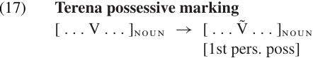 Let us consider some concrete examples, without trying to provide a completely rigorous system for writing such rules. The first-person possessive morpheme in Terena (10) could be represented roughly as in (17). This rule is intended to describe a process which: (i) nasalizes all the vowels in the word; and (ii) adds the grammatical feature [1st pers. poss].