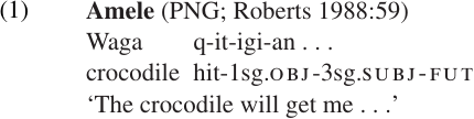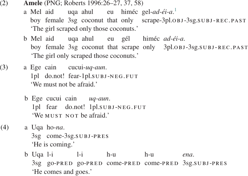 To begin with a specific example, let us look at verbal inflection in Amele, a Papuan language of New Guinea. Verbs in Amele are marked for subject agreement, object agreement (optional), tense, mood, and certain other categories. In most sentences, these markers appear as suffixes on the verb, as in (1).