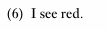 In this example, red is a mass noun, which is consistent with the fact that the red area is unbounded within the visual field of the speaker which is equivalent to the scope of predication of the NP. Crucially, in both scenarios, the red spot is bounded by the visual field in the sense that it is not experienced outside the visual field. However, this is not sufficient for the speaker to construe the red spot as bounded in both scenarios. Indeed, if this were the case, any noun relat ing to the domain of VISION would have to be bounded and therefore a count noun, which is clearly not the case. As this example illustrates, bounding must occur within the relevant domain.