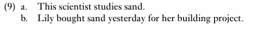 As these examples demonstrate, the mass noun sand can be used to refer to a mass that has no boundaries imposed on it by the context, as in (9a). In this case, the result is generic construal, which means that the noun designates ‘sand in general’. However, mass nouns are often used to designate a mass that does have boundaries imposed on it by the context, as in (9b). In this context, Lily did not buy ‘sand in general’ but a specific amount, probably measured in sacks. The contrast between these two examples illustrates that the regions designated by mass nouns can be externally bounded. However, this does not affect their conception as unbounded masses.