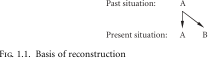 While properties (9a) through (9c) specifically refer to the data presented in the preceding examples, (9d) through (9f) are central to grammaticalization theory in general, and of the methodology used here in particular: They allow us to use a technique of linguistic reconstruction using the situation depicted in Figure 1.1 as a basis. In accordance with this technique, we will say that given a present situation where there are phenomena A and B, such as the ones presented in (9a–9e), we hypothesize that (9f) applies.