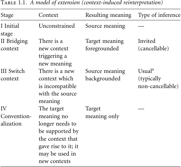 A number of approaches have been used to deal with the phenomena relating to extension (see e.g. Bybee, Perkins, and Pagliuca 1994; Traugott and Dasher 2002: 34–9); in the present work we will use the four-stage model of context-induced reinterpretation depicted in Table 1.1 to describe the most salient characteristics of extension (see Heine 2002b for more details).