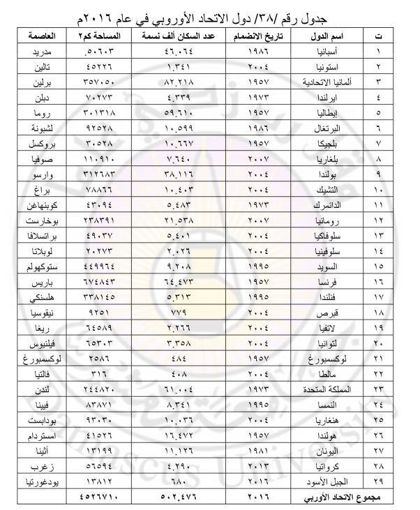 يشكل الاتحاد الأوروبي حالياً أكبر تكتل اقتصادي دولي، يضم 29 بلـــداً أوروبياً، آخرها كان انضمام دولة الجبل الأسود (2016م)، فهو يمتد على رقعة جغرافية تبلغ 4529710كم2 ، وهو ما يعادل نحو 3.3 % من مساحة العالم ونحو 40% من مساحة القارة الأوروبية، يعيش عليها أكثر من 503 مليون نسمة، يشكلون نحو 68.8% من سكان القارة الأوروبية ونحو 7.8% من سكان العالم (2016م).
