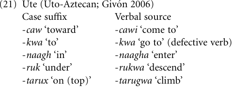 Verb > case marker Verbs are a common source of adpositions (see above), and in some cases they may further develop into case markers. Givo̒n (2006: 24) observes that the Uto-Aztecan language Ute derives all locative case markers from historically-still-traceable precursor verbs which have turned into noun suffixes, no longer carrying any discernible residue of verbal properties; a few examples are provided in (21).