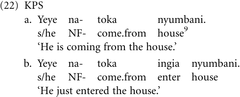 In many of their uses these patterns are ambiguous, as they can still be interpreted with reference to their lexical meaning. For example, the immediate-past marker toka can still be understood in its lexical sense. Some of these use patterns, however, have acquired new contexts where the lexical meaning no longer makes sense—hence, where they can be interpreted meaningfully only with reference to the new grammatical function. Thus, the erstwhile verb toka has also been extended to contexts where its lexical meaning ‘come from’, cf. (22a), is ruled out, that is, where its immediate-past tense function provides the only reasonable interpretation, as in (22b), where the meaning of the verb ingia ‘enter’ is incompatible with that of toka (which also means ‘come out’):