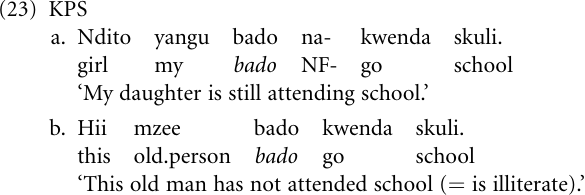 That it is the manipulation of existing forms in new contexts that determines the emergence of new use patterns and functional categories is suggested by the following example. The CS adverb bado has two different, though related, meanings, which are ‘still’ in affirmative and ‘not yet’ in negative constructions, and both meanings are retained in KPS. But in KPS this adverb has served as a basis for new contrasting functional use patterns: When preceded by the non-future (NF) marker na- it denotes an event that continues longer than expected (= ‘still’), cf. (23a). When used without the NF marker it denotes an event that was supposed to have started but has not started as yet (¼ ‘not yet’). However, in the latter use pattern, bado has undergone further desemanticization, in that it tends to be generalized as a negative perfect marker, as in (23b), where the meaning ‘not yet’ does not appear to make much sense.