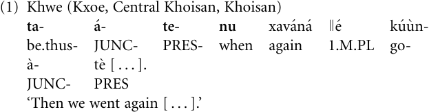 Following other treatments of this subject we will distinguish between coordination, involving two (or more) relatively independent clauses, and subordination, that is a combination of two (or more) clauses where one can be defined as being the main (or matrix, or nucleus) clause and the other as being subordinate to (or dependent on) the main clause on the basis of morphosyntactic properties. As has been pointed out by many authors, and as will also become obvious in subsequent sections, the boundary between the two kinds of clauses is not really neat. In our treatment we will ignore cases where two clauses are reduced to one. This process can be the result of at least two different kinds of processes. One concerns the loss of a main clause whereby the subordinate clause is reinterpreted as the new main clause. Paradigm cases are provided by cleft constructions [It is X that S], where the copular main clause [It is X] is grammaticalized to a focus (and sometimes further to a subject) noun phrase and the subordinate clause [that S] turns into the new main clause, as has happened in a number of languages (see e.g. Heine and Reh 1984: 147–82; Harris and Campbell 1995: 151–68). Another kind concerns subordinate clauses that are grammaticalized (or lexicalized) to adverbials, conjunctions, or parenthetical markers within the main clause. For example, in the Central Khoisan language Khwe (Kxoe) of Namibia, the temporal adverbial clause in (1), meaning roughly ‘when it is like that’, has developed into the temporal conjunction taa̒tenu ‘then’, which has become one of the most frequently used discourse markers of the language. Other cases concern clausal structures that assume functions as modal or evidential markers (see Hopper and Traugott 2003: 207–9; Thompson and Mulac 1991). Such cases concern situations where there already exists an established form of clause subordination, while our interest is with situations where new forms of subordination arise.
