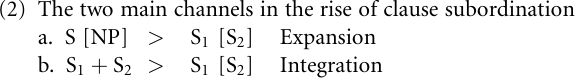 The formulas in (2) show that once either of these two processes has taken place there is recursion, in that one clause (S2) is embedded in another clause (S1). Hopper and Traugott (2003: 176) propose a cline of clause combining leading from parataxis to subordination. This cline concerns only integration (2b); as we will see below, this is not the only way in which clause subordination arises.