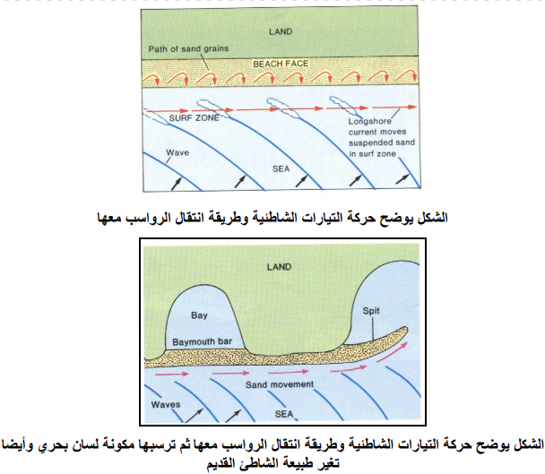 التيارات المحاذية للشواطئ هي المسؤولة عن حمل الرواسب وانتقالها من منطقة إلى أخرى وهي لا تعتمد على اتجاه الهواء وعند اصطدامها مع الشاطئ تصبح حركتها إلى الخلف عموديا على امتداد الشاطئ كما في الشكل المرفق الذي يوضح حركة التيارات الشاطئية وطريقة انتقال الرواسب معها. مثلا ضمن الخليج العربي Arabian-Persian Gulf تكون حركة التيارات الشاطئية بوجه عام عكس عقارب الساعة فهي تبدأ من مضيق هرمز (Strait of Hormuz) بمحاذاة شواطئ إيران باتجاه شط العرب شمالا، ثم تتحرك جنوبا بمحاذاة شواطئ دولة الكويت حتى تنتهي مرة أخرى عند مضيق هرمز، لذلك معظم الرواسب الميكانيكية من الرمل والغرين والطين التي تصل إلى الخليج العربي بواسطة شط العرب تنتقل باتجاه الكويت وتترسب ضمن البيئات الترسيبية المختلفة في الجزء الشمالي منها، أما الأجزاء الجنوبية فهي تعاني من نقص في الرواسب الميكانيكية لذلك يطغى ضمنها الترسيب الكيميائي والكيميائي العضوي.