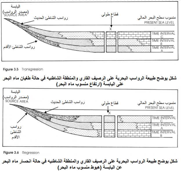 يعتبر منسوب ماء البحار الحد الفاصل بين عمليات التعرية والترسيب وهو دائما يعتبر على أنه مستوى (Base) الصفرالذي تبدأ بعده قياس الارتفاعات لسطح الأرض، بمعنى آخر يعرف على أنه مستوى القاعدة Level لجميع التضاريس الأرضية ومنسوب سطح الماء للبحار والمحيطات معرض للارتفاع والهبوط إلى مستويات أعلى أو مستويات دون الصفر الذي هو مستوى القاعدة الارتفاع والهبوط يحدث نتيجة لعاملين أساسيين إما بسبب العصور الجليدية والعصور بين الجليدية أو بسبب الحركات التكتونية التي تتعرض لها القشرة الأرضية في الحالة الأولى يتغير المنسوب العام لمستوى سطح البحر ضمن جميع البحار والمحيطات على سطح الأرض في وقت واحد (Eustatic Sealevel Change) نتيجة لتعرض الأرض لعصر جليدي (Glacial Period) أثناء العصور الجليدية تقل درجات الحرارة كثيرا خاصة في المناطق القطبية والباردة، بمعنى أخر تزيد مساحة الأقطاب وتزداد بذلك كمية المياه الموجودة على هيئة جليد خاصة في القطب الشمالي والمناطق الباردة المحيطة بها إذا عرفنا أن كمية المياه الموجودة ضمن الكرة الأرضية ثابتة أي كل ما يتبخر من البحار والمحيطات يرجع مرة أخرى إليها وأن المياه الموجودة ضمنها متصلة مع بعضها البعض، لذلك أثناء انخفاض درجات الحرارة الأقطاب سوف تمتص الأقطاب والمناطق الباردة المحيطة بها المياه الموجودة ضمن البحار والمحيطات المتصلة مع بعضها البعض وتتحول على هيئة جليد وبذلك ينخفض منسوب سطح الماء في البحار في آن واحد والعكس صحيح بالنسبة للعصور بين الجليدية ( (Interglacial (Period) التي تتميز بارتفاع درجات الحرارة وذوبان الجليد وبذلك ينحسر الجليد ويتراجع إلى القطبين ويرتفع المنسوب العام لسطح البحار والمحيطات والارتفاع في منسوب سطح الماء إما أن يصل إلى مستوى القاعدة الذي يساوي الصفر في الارتفاعات أو أن يصل إلى مستويات أعلى منه، وذلك يعتمد على درجات الحرارة التي تصل لها الكرة الأرضية بوجه عام وهي تتأثر بكثير من العوامل الطبيعية وعوامل أخرى غير طبيعية التي سببها المباشر الإنسان. أما العامل الثاني والذي هو الحركات التكتونية التي تتعرض لها القشرة الأرضية فهو يؤدي إلى ارتفاع أو انخفاض منسوب سطح الماء ضمن نطاق محدود، وهي عادة تكون المنطقة التي تعرضت إلى حركات أرضية مما أدت إما لارتفاع المنطقة فوق مستوى سطح البحر أو انخفاضها دون مستوى سطح البحر، وهو ما يعرف بالتغير التكتوني لسطح ماء البحار والمحيطات (Tectonic Sealevel Change). فالارتفاع والانخفاض في منسوب سطح الماء له أعظم الأثر في تشكل وتغيير هيئة الشواطئ ضمن الكرة الأرضية وهو يعتمد على درجة ميل وانحدار المنطقة الساحلية. فارتفاع منسوب الماء يؤدي إلى طغيان ماء البحر على الشواطئ (Marine Transgression) خاصة إذا كانت المنطقة الساحلية قليلة الانحدار مما يؤدي إلى تقدم البيئات البحرية باتجاه اليابسة لمسافات كبيرة وتصبح بذلك البيئات البحرية الشاطئية القديمة أعمق وأيضا الرصيف القاري يصبح أعمق بسبب هذا الارتفاع ويطغى ماء البحر على المناطق السهلية المحاذية للشواطئ، أما عند انخفاض منسوب سطح الماء ينحسر الماء عن المناطق الشاطئية (Marine Regression) مما يؤدي إلى تراجع البيئات البحرية بعيدا عن الشاطئ القديم وبذلك تصبح البيئات البحرية على الرصيف القاري أقل عمقا ويتكون شاطئ جديد وتزداد بذلك مساحة اليابسة الاختلاف والتغير في منسوب سطح البحار يؤدي إلى تغير البيئات البحرية الترسيبية ونوعية الكائنات الحية التي تعيش وتحيى ضمن البيئات المختلفة ، وتؤثر على الإنسان أيضا نتيجة لتغير مساحة اليابسة والأراضي ونوعية الغذاء الذي يستخلصه من البحار.