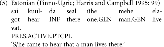 A similar structure is exhibited by the Estonian example in (5), which illustrates one of the two ways in which complement clauses having speech-act or mental-state verbs as main verbs are expressed in this language: The verb is non-finite, constructed in the present tense of the active participle (3b), and the subject/agent appears in the genitive case (GEN) (3d):