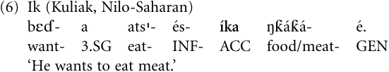 Similarly, in the Ik language of northeastern Uganda, the complement verb ‘eat’ in (6) is non-finite and appears in the accusative case (ACC) (3b) and the patient ‘food’ of the complement clause in the genitive case (GEN) (3e).