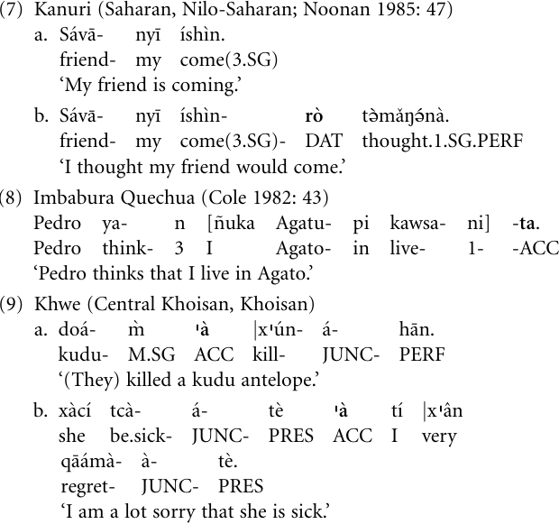 In the Nigerian language Kanuri, the dative case suffix (or enclitic)-rò (DAT) is attached to the finite clause in (7a) to form complement clauses (7b), and in the Andean language Quechua (8) and the Khwe language of Namibia (9) it is the accusative case marker (ACC), cf. (9a), which is attached to the finite complement clause (9b).