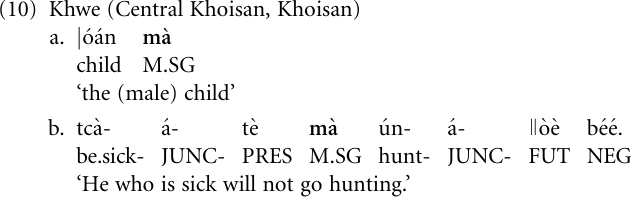 The expansion strategy, whereby a clausal proposition is treated like a noun, is found in headless relative clauses in some languages, where the clausal proposition receives a marker otherwise reserved for nouns; almost invariably, this marker is a definite article. In the Khwe language just mentioned this is a person-gender-number marker, which is used primarily to signal that a noun or noun phrase is referential or definite (10a), but whose use has also been extended to present relative clauses (10b).