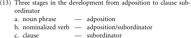 Presumably this is an example of a development leading straight from adposition (or case marker) to clause subordination. But perhaps more common is a development as sketched in (13), where there is an intermediate stage where the complement is neither a noun phrase nor a clause but rather a verb having some nominalizing morphology on it, such as an infinitive, participle, or nominalization marker.