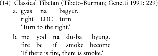 Example (14) illustrates the extension from locative postposition (LOC), cf. (14a), to conditional subordinator (14b) in Classical Tibetan, and Table 5.1 lists the main channels of grammaticalization.