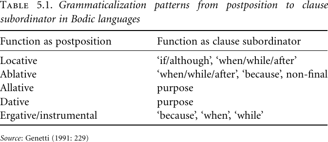 There is a wealth of data dealing with the process leading from prepositions or postpositions, being heads of noun phrases, to adverbial clause markers, that is, heads of adverbial clauses. The mechanism involved is described by Genetti for Bodic languages of Tibeto-Burman in the following way: