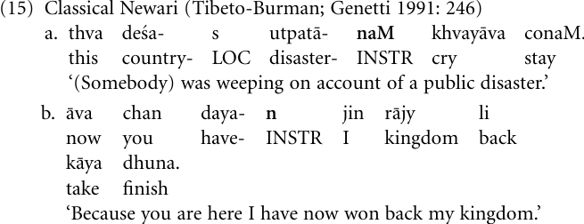 As we observed above, in the transition from adposition to clause subordinator there tends to be an intermediate stage where the relevant form can be interpreted with reference to both. The following example from Classical Newari exhibits this intermediate stage: (15a) illustrates the postposition stage with a clearly nominal morphology suffixed to a noun; (15b) shows the intermediate stage, where the instrumental morpheme (INSTR) is ambiguous, in that the clause can be analyzed either as a nominal clause marked with a case suffix, or as a finite verb followed by a causal subordinator.