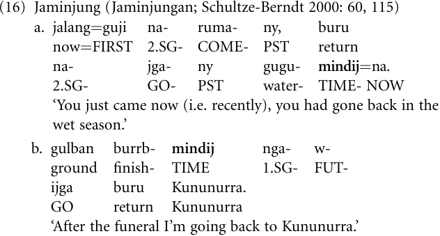 While the development from adposition or case marker to subordinator has given rise in many languages to finite subordinate clauses, it was restricted to non-finite subordinate clauses in other languages. In the Jaminjung language of Northern Australia, the TIME case marker-mindij may be added to finite (inflecting) verbs to form temporal subordinate clauses, but otherwise the use of the case suffixes (or clitics) of this language, including-mindij, is extended only to non-finite clauses. Thus, in (16a), -mindij heads a noun where as in (16b) it heads a non-finite subordinate clause.