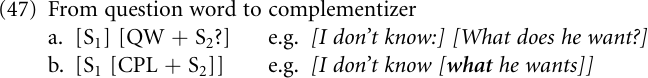 Question words do not only develop into relative clause markers; they may in the same way give rise to markers introducing complement clauses, that is, complementizers. European languages have plentiful examples of question words (QW) meaning ‘what?’, ‘who?’, ‘when?’, ‘where?’, ‘why?’, etc. being grammaticalized to devices for presenting complement clauses. The process appears to have involved clause integration of the following kind: Two clauses, where one is an interrogative one (47a), are conflated into one sentence, where the question word assumes the function of a complementizing pronoun and the interrogative clause into a complement clause, as sketched in (47b).1