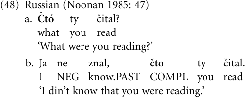 The Russian interrogative pronoun c̆to̒ ‘what?’ has given rise to both a relative pronoun and a complementizer. Example (48a) illustrates the interrogative and (48b) the complementizer use. That the latter is a grammaticalized form of the former is suggested by the fact that it is contextually restricted (decategorialization) and that it has lost the ability to be stressed (erosion), which is a characteristic of c̆to as a pronoun (Noonan 1985: 47).