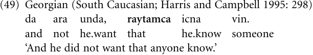 While common in Indo-European languages, this channel is also found in some other languages. One example is provided by Georgian, where the complementizer ray-ta-mca ‘that’ is derived from the question word ray ‘what?’ (Harris and Campbell 1995: 298):