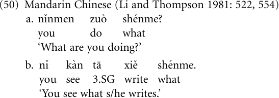 Another example comes from Mandarin Chinese, where question words appear to have grammaticalized to pronouns introducing complement clauses. For example, in (50a), she̒nme ‘what?’ is an interrogative pronoun while in (50b) it is an object complementizer.