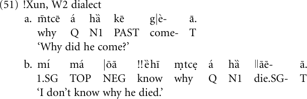 Finally, we may cite an example from the North Khoisan language !Xun, where the question word m̄tcē...-ā ‘why?’, illustrated in (51a), appears to have been grammaticalized to a reason complementizer; note that the complementizer in (51b) has retained the question marker a̒ (Q).