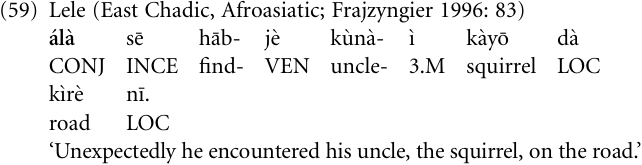 We have been looking at a range of different clause types and nominal sources for adverbial clauses. In concluding, one may mention an example that is unusual with reference to both the lexical source and the grammaticalization channel employed, but which demonstrates the flexibility of the channel from noun to clause subordinator. This example concerns the Chadic language Lele (Frajzyngier 1996: 81–3), and the nominal source is the noun a̒là ‘God’ (borrowed from Arabic Allah ‘God’), which appears to have given rise to a marker of adversative clauses (‘but’), as illustrated in (58). The reason for adding this example of the noun-to-subordinator channel is that it illustrates the range of cognitive processes that are at work in the rise of clause subordination.