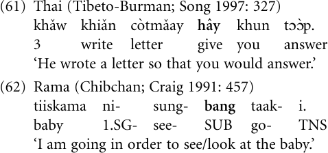 Verbs expressing goal orientation are a not uncommon source for adverbial clauses of purpose, such verbs being, in particular, ‘give’ (Heine and Kuteva 2002a: 154–5) and ‘go to’. In the following example (61) from Thai, the verb hây ‘give’ functions as a purposive marker, while (62) illustrates the grammaticalization of the verb bang ‘go’ to-bang, a subordinating conjunction of goal or purpose, in the Central American language Rama.