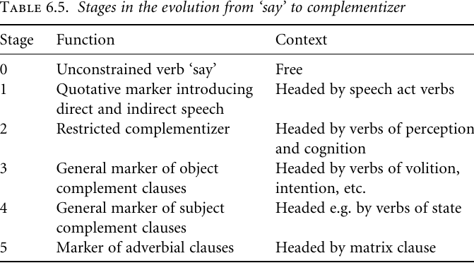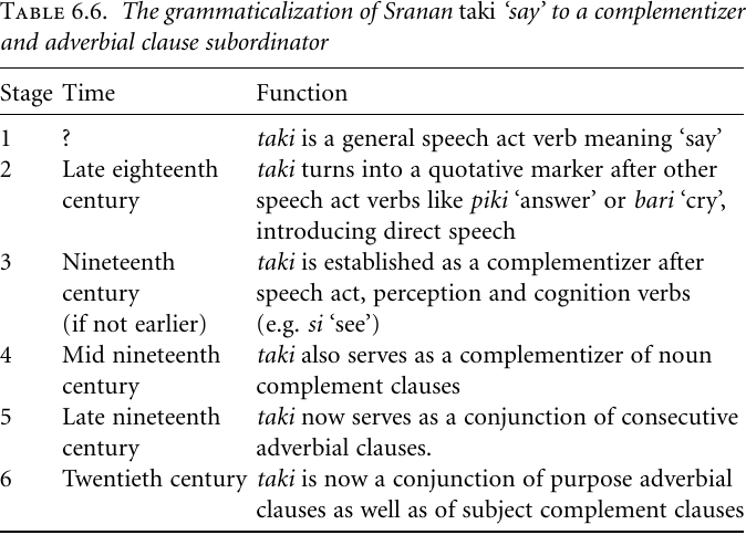 Our second case concerns another crosslinguistically widely attested pathway from non-recursive to recursive construction of clause subordination, namely one leading from verbs meaning ‘say’ to complementizers as well as to adverbial clause subordinators. The main stages of this process are summarized in Table 6.5 (see “The verb channel” for general discussion). The following is a summary of the detailed analysis by Plag (1993, 1994b, 1995), describing the genesis of clause subordination in Sranan, where the verb taki ‘say, talk’ (< English talk) has been grammaticalized to a complementizer and eventually to an adverbial clause subordinator.
