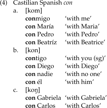 Another example of regressive assimilation is found in Spanish. Word-final nasal consonants assimilate in place of articulation to a following consonant in many different contexts. For example, the preposition con ‘with’ has at least three phonetic realizations: [kom], [kon], and [koŋ]. (In fact, there are five phonetic realizations of con, but we are simplifying for clarity.) Their distribution is predictable, just like that of the English past tense suffixes. We find [kom] before labial consonants, [kon] before alveolars and vowels, and [koŋ] before velars. Again, we can identify a basic form, in this case /kon/. We know it is basic because it occurs in two unlike environments: before certain consonants and before all vowels.