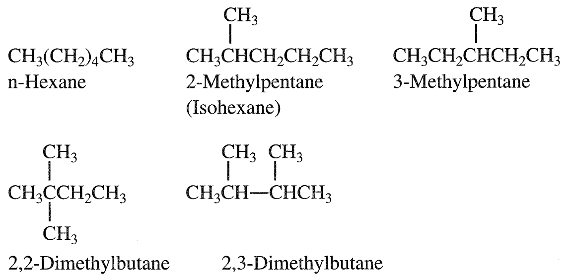 Alkanes are saturated hydrocarbons having the general formula CnH2n+2. The simplest alkane, methane (CH4), is the principal constituent of natural gas. Methane, ethane, propane, and butane are gaseous hydrocarbons at ambient temperatures and atmospheric pressure. They are usually found associated with crude oils in a dissolved state. Normal alkanes (n-alkanes, n-paraffins) are straight-chain hydrocarbons having no branches. Branched alkanes are saturated hydrocarbons with an alkyl substituent or a side branch from the main chain. Abranched alkane with the same number of carbons and hydrogens as an n-alkane is called an isomer. For example, butane (C4H10) has two isomers, n-butane and 2-methyl propane (isobutane). As the molecular weight of the hydrocarbon increases, the number of isomers also increases. Pentane (C5C12) has three isomers; hexane (C6H14) has five. The following shows the An isoparaffin is an isomer having a methyl group branching from carbon number 2 of the main chain.