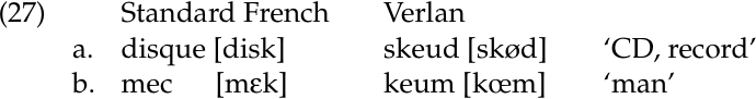 For Bullock (1996), the interesting question is how the phonology of secret languages like verlan compares to the phonology of the language they are based on. We see that verlan respects the basic syllable structure of French. French speakers who use verlan are aware on some level of prosodic entities such as onset, nucleus, coda, and syllable. (The same can be said of English speakers who use Pig Latin.) Nonetheless, Bullock and other researchers who have looked at French secret languages note that the phonology of verlan is not the same as that of the standard language. We see in (26d) that [ɲ] is a licit onset in verlan. It is not in standard French. Furthermore, in verlan, only the liquids [l] and [ʁ] are permitted in the codas of polysyllabic words. Bullock presents the example of bifton ‘cash, banknotes’, syllabified in standard French as bif.ton. In verlan, it would become fton. bi [ftõ.bi], because [f] cannot form the coda of a polysyllabic word. This example deviates from standard French phonology in another way: [ft] is not a possible onset in French. Finally, it is significant that we formulated the constraint on codas by referring to “polysyllabic words.” In verlan monosyllables, consonants other than [l] and [ʁ] are welcome in word codas: