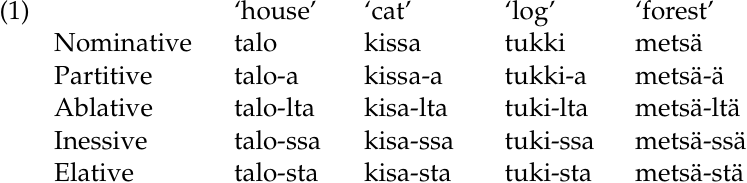 The most salient feature of Kujamaat Jóola’s phonology happens to be something that is profoundly related to its morphology – vowel harmony. Vowel harmony is the agreement among some or all of the vowels in a word with respect to a given feature, such as height, rounding, or backness. In Finnish, for example, vowels harmonize for frontness. If all the vowels in a root are front, then vowels in any suffix must also be front, as seen by the partial declension paradigm of ‘forest’ in the last column of (1) below. If any of the vowels in the root are not front, as seen in the partial declension paradigms of words meaning ‘house’, ‘cat’, and ‘log’ in the first three columns of (1), the suffix vowel does not change. Two of the roots below, kissa ‘cat’ and tukki ‘log’, undergo degemination in the ablative, inessive, and elative (degemination is shortening of a long consonant, as in tukki → tuki):