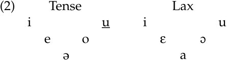 All vowels in a word must be either tense or lax. Since tense vowels are dominant, whenever any tense vowel is found in a morphologically complex word, vowels that are otherwise lax become tense.1 Harmony spreads out both ways from a tense vowel: