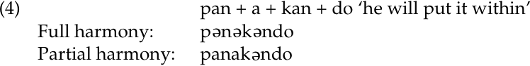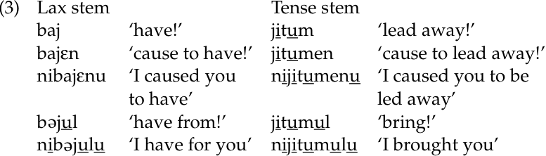 As we see in (3), the process of vowel harmony leads to the existence of two allomorphs, or variants, for all morphemes with lax vowels that can occur together in a word with morphemes containing tense vowels. The stem /baj-/ ‘have’, for instance, may be realized as [baj-] or [bəj-]. The causative marker /-εn/ also occurs as [-en], and the sub ject prefixes /ni-/ ‘I’ and /u-/ ‘you (sg)’ as [ni-] and [u-]. Morphemes containing tense vowels, by contrast, never alternate, because tense always dominates over lax. The stem /jitum/ ‘bring’ always appears with the same shape, because its vowels are underlyingly tense. Likewise, the directional marker /-ul/ has an underlyingly tense vowel. Both /jitum/ and /-ul/ trigger vowel harmony but are never affected by it. We can tell whether a morpheme’s vowels are basically tense or lax by whether it alternates; alternating morphemes whose vowels are sometimes lax and sometimes tense are underlyingly lax, while non-alternating morphemes whose vowels are always tense are underlyingly tense.