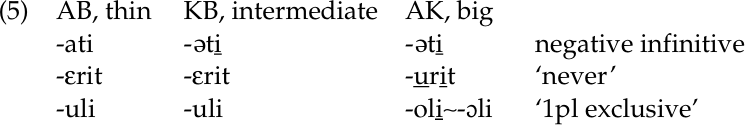 A second area in which the big–thin distinction is apparent is suffixes. Three Kujamaat Jóola suffixes have regional variants that differ in part in containing tense versus lax vowels. AB, Sapir’s ‘thin’ consultant, used the lax variants of the three suffixes. KB, the intermediate consultant, used the lax variants of two, but the tense variant of the third. AK, Sapir’s ‘big’ consultant, used the tense variants of two suffixes. The tense and lax variants of the third suffix were in free variation (Sapir 1975: 5):