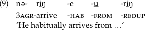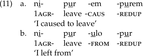 Finally, the derivational suffix -u ‘from’ differs from other derivational affixes in not reduplicating when the verb stem is reduplicated for verb emphasis (11b). Other derivational suffixes, again represented by the causative, do participate in reduplication: