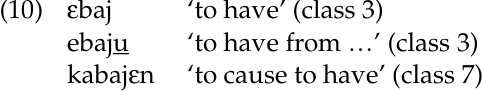 -u is also exceptional in not acting as an added syllable on the verb stem for purposes of calculating the allomorphs of the infinitive. Recall from Words and Lexemes that infinitives, like nouns, are assigned to noun classes, and that monosyllabic stems take the class 3 prefix ε-, while stems of more than one syllable take the class 7 prefix ka-. As seen in (10), other derivational suffixes, represented here by the causative -εn, result in the infinitive being assigned to class 7, while -u ‘from’ does not.